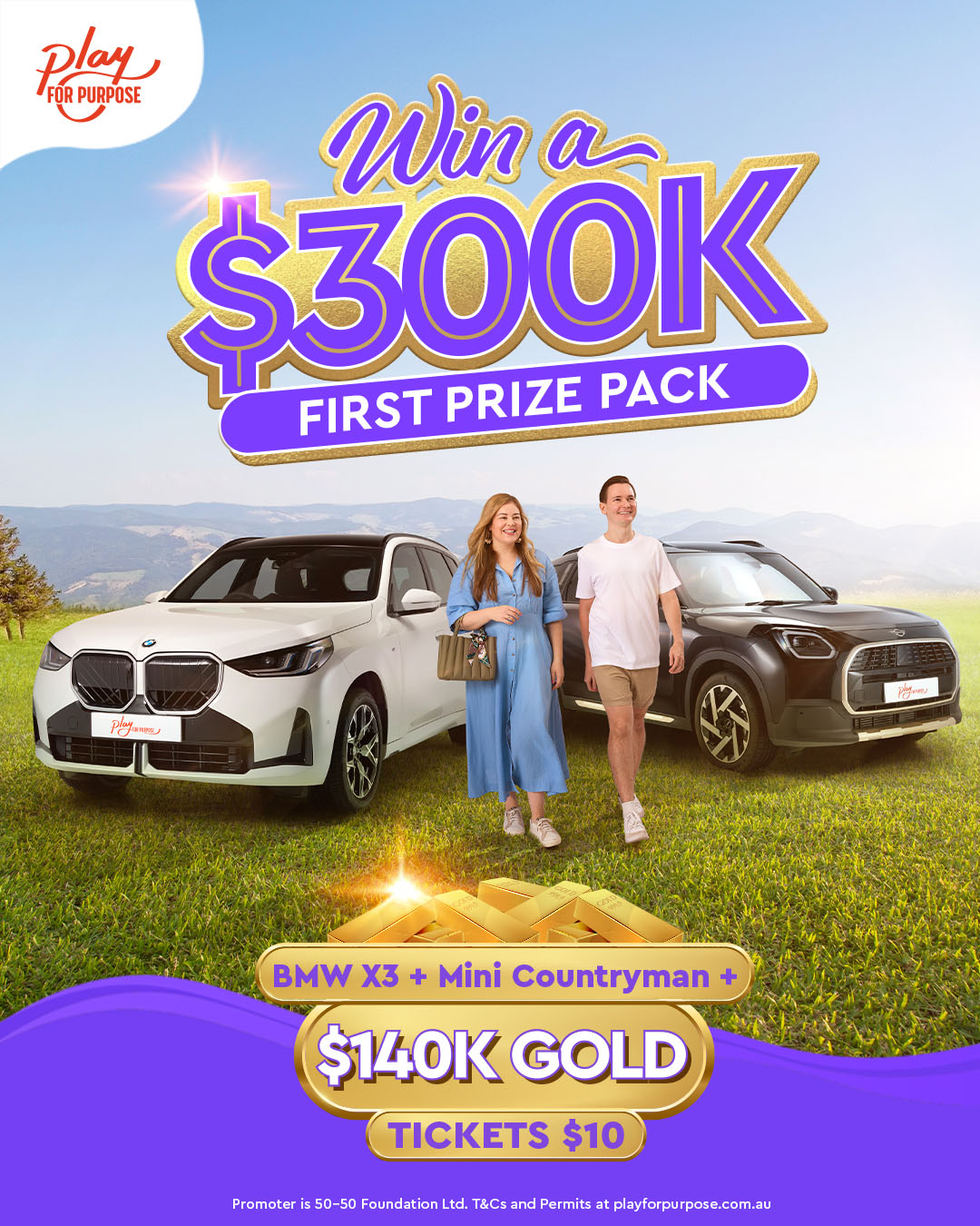 Grab your ticket today for a chance to win the $300,000 first prize pack including a $99,000 BMW X3 20 xDrive and a $60,000 Mini Countryman C PLUS $140,560 worth of gold bullion and hundreds of other fantastic prizes!