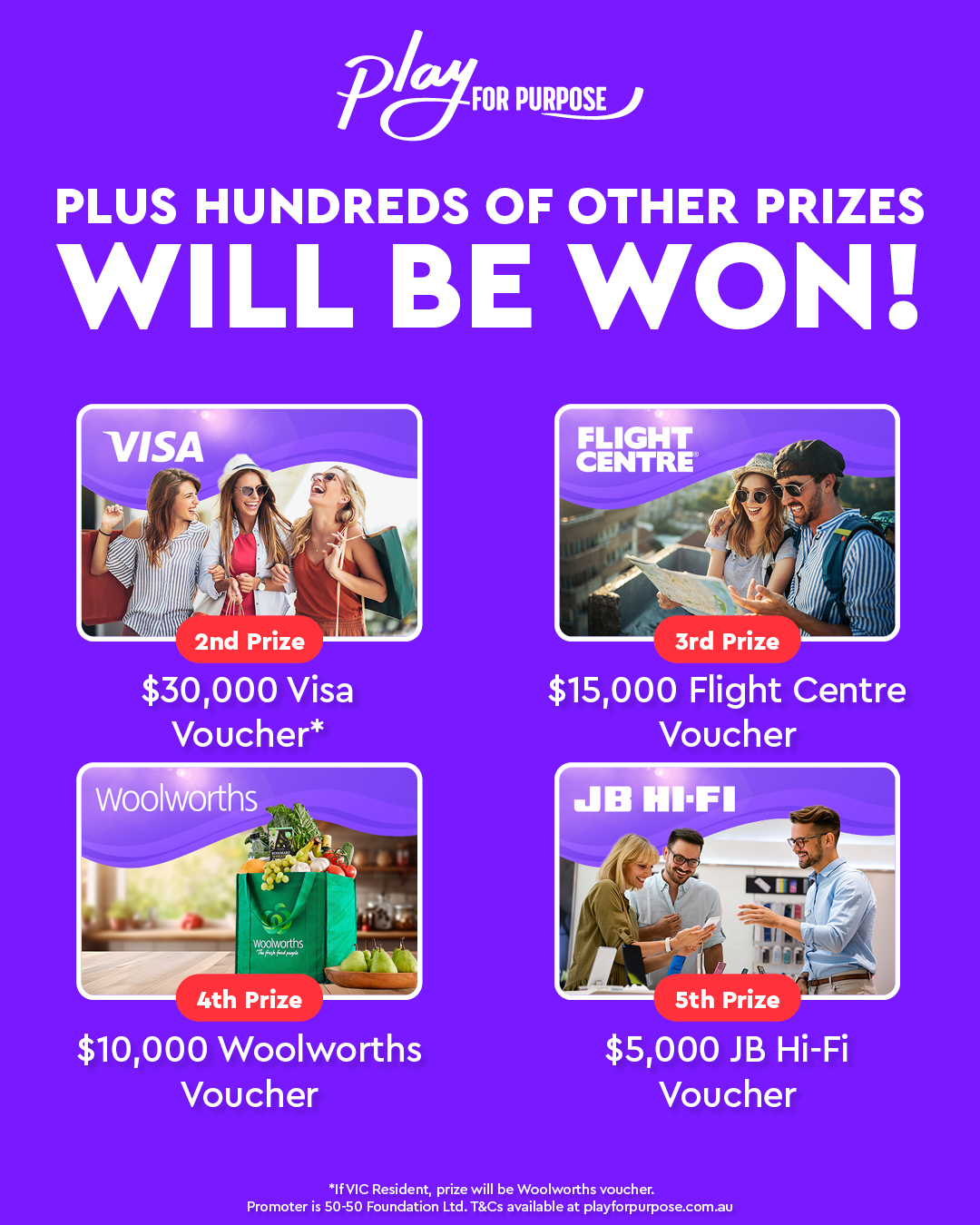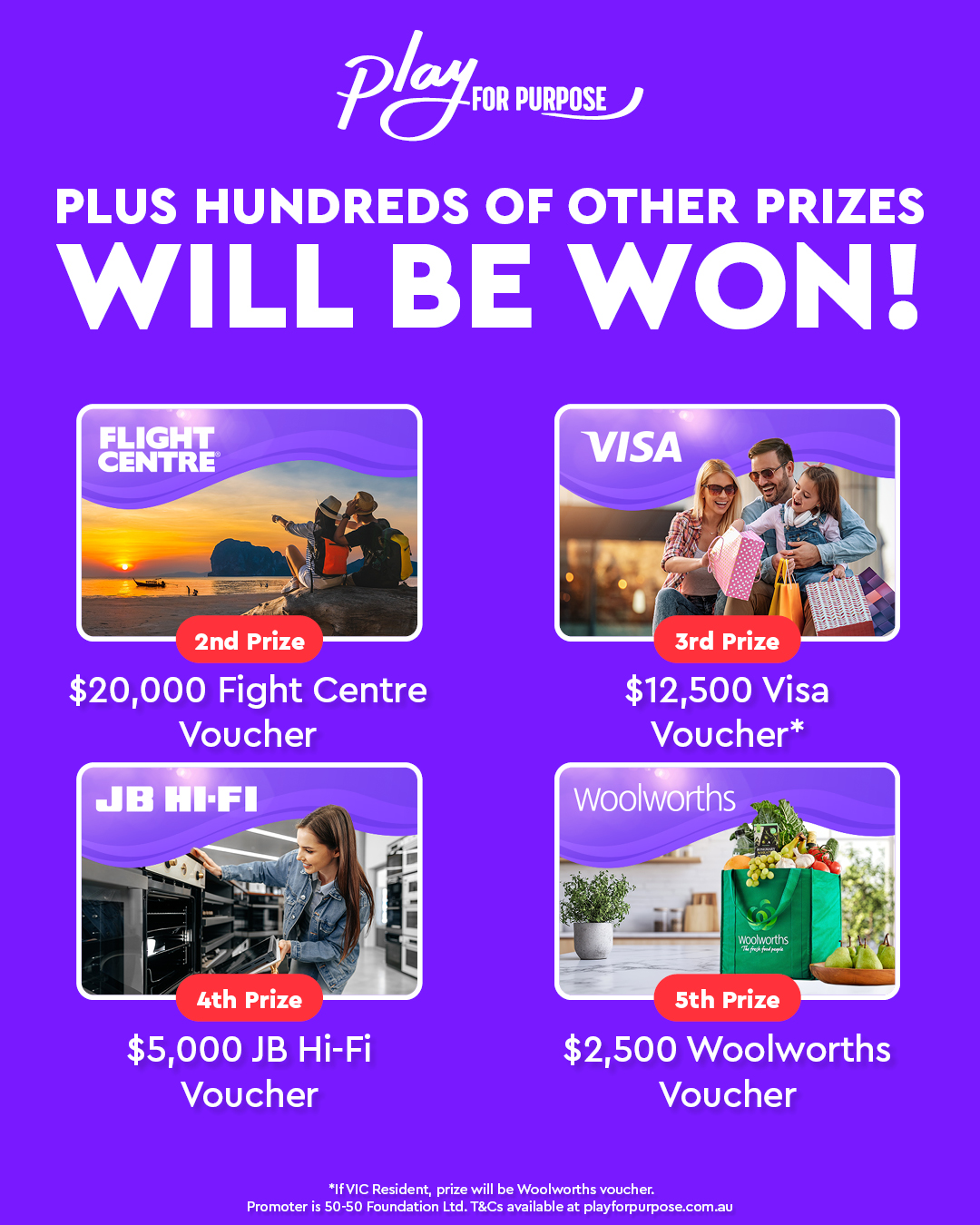 Disclaimer: Promoter is 50-50 Foundation Ltd. Permits and T&Cs at playforpurpose.com.au